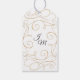 "Welcome Script Calligraphy Black and Gold Scrolls Favor Gift Tags." Elégant défilement de parties scintillant dorée motifs jumelés avec la police calligraphique ornée de lettres et votre message d'amour pour vos invités. L'envers a une conception de travail de défilement partout avec vos initiales monogrammes. Art dessiné sous forme graphique par Audrey Jeanne Roberts, artiste titulaire d'une licence internationale, copyright.