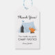 Jolie fête d'anniversaire du thème du camping avec une tente bleue et un feu de camp à côté. Le texte dit "merci ! vous avez rendu mon camp-tastic !" Customisez ce produit en ajoutant le nom de votre enfant au bas. Idéal pour la fête du garçon.