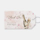 Élevez votre fête de mariage avec ces étiquettes cadeaux de remerciement de mariage élégantes aux pétales pétillants. Ce design présente une écriture élégante "Merci" sur fond de pétales roses romantiques et féminins de différentes nuances et une illustration fantaisiste de boissons pétillantes.