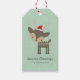 Balise cadeau personnalisée Joyeuses Fêtes. Un design mignon et festif avec une ambiance minimaliste hipster. Illustration de charme d'un cerf brun en bois portant un chapeau de santa rouge - style hipster. Placez-vous sur un arrière - plan vert rétro. Personnalisez avec votre nom.