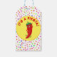 Étiquettes-cadeau personnalisées. Piments de piment mignons en style dessin animé disant "C'est une fiesta !" Motif Confetti dans l'arrière - plan. Vierge à l'arrière pour les messages manuscrits. Idée de décoration cadeau pour les amateurs de cuisine et de culture mexicaine.