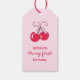 Balise cadeau d'anniversaire à thème "Cherry premier anniversaire" avec cerises illustrées attachées avec un arc rose.
