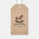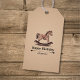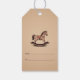 Une étiquette cadeau avec un dégradé et un fond beige texturé et une illustration d'un cheval à bascule artisanal aux tons bruns. Parfait pour vos cadeaux à un enfant.