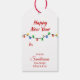 Sur le devant de cette étiquette cadeau de vacances se trouve l'image d'un mignon chien Boston Terrier dans un sac cadeau de Noël rouge et blanc. Derrière le chien se trouve une série de lumières colorées de Noël. Le texte en haut dit "Joyeux Noël". Le dos de la balise répète l'image des lumières de Fêtes, avec des champs de texte en rouge pour vous permettre de customiser.
