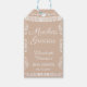 Beautiful Beige baby shower favor tag featuring delicate white papel picado details and elegant script lettering. The phrase “Muchas Gracias” adds a charming Spanish touch, while the custom name and date make it uniquely yours.