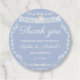 This round Cielito Lindo baby shower thank you tag features delicate white papel picado bunting and ornate floral borders on a soft dusty blue background. The elegant script “Thank You” paired with personalized names and event date makes it a beautiful finishing touch for your baby shower favors.