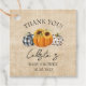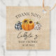 Ce design présente trois citrouilles adorables en plaid orange, noir et blanc, et empreinte de léopard sur un arrière - plan burlap bronzé. La citrouille orange du centre est agrémentée de jolis tournesols jaunes. "Merci !" est au sommet. Le nom de la mère enceinte dans une typographie cursive manuscrite est présenté avec "Baby shower" et la date. Ce sont les étiquettes parfaites à ajouter aux baby showers faveurs et sacs.