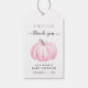 Une petite fille simple et mignonne douche merci de préférence tag avec une aquarelle rose pastel d'un citrouille avec "un gentil petit merci" et "un doux petit citrouille est en route" écrit dans une typographie grise stylisée et un script swash.