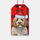 Une étiquette cadeau de vacances rouge et noir coordonnées avec notre emballage cadeau et ruban pour un regard complet sur le cadeau de vacances Cockapoo amoureux des chiens.