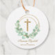 Un faux croix de parties scintillant or et une couronne de feuilles d'eucalyptus mettent en évidence ces remerciements pour les étiquettes avec votre personnalisation en lettrage chic. Parfait pour la première communion, le baptême ou le baptême de votre enfant. Objets CORRESPONDANTS disponibles dans notre magasin.