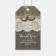 country chic mariage merci étiquettes avec fer à cheval rustique couple, dentelle, bois d'écorce et respiration de bébé