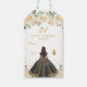 Cette étiquette cadeau d'anniversaire de naissance élégante et glamour peut être personnalisée avec un nom. Le design présente une belle princesse aux cheveux foncés et à la peau foncée dans une robe de bal noire. Le texte combine écriture manuscrite et polices sans serif modernes pour un look élégant et sophistiqué. Les compositions florales, les papillons et les confettis d'or créent un mélange parfait de rustique et de chic. C'est parfait pour offrir des cadeaux et des faveurs festives. Graphiques par www.etsy.com/uk/shop/SunflowerDayLove