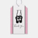 Balise cadeau Merci avec une illustration noire d'un ballet danseurs pantoufles et ses jambes inférieures qui sont transparentes permettant la couleur de l'arrière - plan de montrer à travers. Ballerina se tient sur ses orteils, en pointe. Arrière - plan est un motif en pois blanc sur rose.
