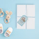 Utilisez ces étiquettes de cadeaux de remerciement assorties pour les gâteries de vos invités. Joli ours en peluche brun sur motif à chèque blanc et bleu bébé avec panier à pique-nique, lapin lapin lapin et sucette. Modèles fournis.