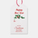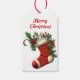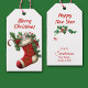 Sur le devant de cette étiquette cadeau de vacances se trouve l'image d'une adorable petite souris grise qui sort d'un bas rouge orné. L'image est entourée de fleurs saintes, de baies rouges et de poinsettia. Le texte en haut dit "Joyeux Noël". L'arrière de la balise a une autre image d'une spring sainte, avec des champs de texte en rouge pour vous permettre de customiser.