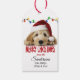 On the front of this Holiday gift tag is an image of a cute Goldendoodle dog wearing a red and white Santa Claus hat. Behind the dog is a string of colorful Holiday lights. The text at the bottom says "Merry Christmas". The back of the tag repeats the image with text fields for you to customize or blank out if you wish.