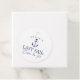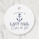 Créez l'ambiance pour votre enterrement de vie de jeune fille sur le thème nautique ou maritime avec ces adorables étiquettes personnalisées rondes. Le design présente une illustration de navire bleu marine surmontée d'un petit cœur, avec deux lignes de texte personnalisé en dessous ; illustré avec "Dernière Voile Avant le Voile". Ajoutez le nom de la mariée en courbe en haut. Les couleurs peuvent être modifiées pour correspondre à vos couleurs préférées en utilisant l'outil de conception de Zazzle.