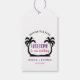 Bienvenue à vos invités à votre mariage de destination avec un merveilleux sac cadeau avec étiquette cadeau personnalisé avec les noms de couple, date mariage et emplacement. L'illustration des palmiers encadre les détails du mariage sur la plage.