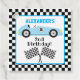 Une jolie voiture de course bleue de style rétro avec texte customisé. Le cercle extérieur est un motif de course. Le numéro au milieu de la voiture peut être customisé, ainsi que toutes les formulations.