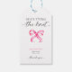 Étiquette cadeau personnalisée pour la douche de mariée "Elle noue la gerbe" avec un noeud rose élégant aquarelle.