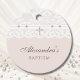 Personalize this Christian Baptism Favor Tag to add a thoughtful and elegant touch to your special day. The design features a cross in elegant soft beige pearl graphics, complemented by delicate white lace and pearl details against a soft pink-beige background. Perfect for a minimalist christening, simple baby dedication, or vintage-inspired celebration, this favor tag combines sophistication with a timeless charm. The mocha brown typography and graceful script font adds a warm and inviting touch. Ideal for attaching to your baptism favors, these tags are a beautiful way to say “thank you” to your guests while celebrating your little one’s faith-filled milestone. Be sure to see the collection for matching items to complete your coordinated look.