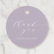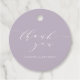 Ajoutez une touche d'élégance à vos faveurs de mariage avec cette belle étiquette ronde de remerciement. Doté d'un arrière - plan de lavande douce et d'une police de script délicate, ce tag est parfait pour exprimer de la gratitude à vos invités dans le style. Personnalisez-le avec vos noms pour une touche personnalisée qui rendra votre mariage, douche nuptiale ou événement spécial encore plus mémorable. Idéal pour attacher des cadeaux, des faveurs ou des sacs de fête, ce tag polyvalent est à la fois sophistiqué et fonctionnel, ajoutant une finition polie à toute célébration.