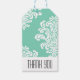 Un motif damassé élégant en aqua et blanc avec du texte "Merci". Le verso de cette étiquette cadeau a été laissé vide pour votre message manuscrit, ou vous pouvez ajouter votre propre texte personnalisé en choisissant l'option "customiser". Imaginez la beauté de ces étiquettes de cadeaux sur les faveurs de mariage, les cadeaux d'hôtesse, ou pour d'autres occasions de cadeaux. Vous pouvez customiser le texte en remplaçant l'exemple de texte "merci" figurant dans le modèle de conception.