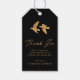 Ces magnifiques marques de faveur de mariage présentent deux oiseaux volant ensemble dans un faux papier doré au-dessus d'un arrière - plan noir pur. Faux feuille d'or dit, "Merci" dans la typographie stylisée. Élégant, élégant, moderne et unique, parfait pour les invités lors de votre journée spéciale !