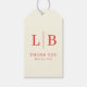 This wedding favor tag features a minimalist design with a light beige background, creating an elegant and modern look. The bold red vertical line separates the initials "L" and "B," printed in a classic serif font, while the words "THANK YOU" are displayed below in a lighter weight of the same typeface. The overall style is clean and sophisticated, perfect for expressing gratitude at your special event. Its simple composition and soft color palette make it ideal for adding a touch of refinement to any celebration.