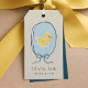 Mignon rencontre élégant avec ces jolis tags de faveur de baby shower avec un canard en caoutchouc dessiné à la main à l'intérieur d'un cadre de ruban. La typographie est chic et élégante.