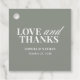 Ces élégantes étiquettes de remerciement mariage luxe et élégantes sont dotées d'un arrière - plan vert sage et d'un mélange de texte blanc classique et de calligraphie moderne qui dit "amour et merci", pour un design élégant et minimaliste parfait pour votre mariage intemporel et formel.