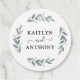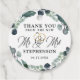 Beau mariage merci les étiquettes de faveur avec le message MERCI DU NOUVEAU MR & MRS. sur le front accentué avec aquarelle sauge vert et bleu-vert eucalyptus vert et moderne, écriture élégante, anneaux de mariage et nom et date et le dos a les prénoms du couple. MODIFICATIONS : Modifiez le style, la couleur, la taille et le placement de police de texte personnalisé en cliquant sur CUSTOMISER PLUS LOIN sous la section PERSONNALISER. Contactez le concepteur via Zazzle Conversation ou makeitaboutyoustore@gmail.com si vous souhaitez modifier ce design ou sur un autre produit.