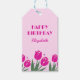 Fleur de tulipe rétro avec typographie vibrante sur étiquette cadeau d'anniversaire arrière - plan rose. Accessoires de fête élégants. Customisez le texte pour répondre à vos besoins !