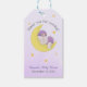 Un adorable dessin d'éléphant à bébé illustrant l'illustration d'un éléphant mignon dans une couche violette et d'une beanie fleurie sucrée qui s'effondre sur une lune au croissant jaune avec des étoiles scintillantes qui l'entourent. Personnalisez cette étiquette cadeau de goodies mignonnes avec vos propres mots et détails de fête pour répondre à vos besoins. Une ligne complète d'articles de coordination disponibles dans notre magasin.