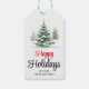 Arbre de Noël extérieur Happy Holidays tag cadeau. Ce décor extérieur de Noël arboré présente une scène hivernale époustouflante remplie d'arbres enneigés, ornés de décorations de Noël colorées. L'expression "Happy Holidays" se distingue par son importance, tandis que les flocons gris doux tombent doucement dans l'arrière - plan, ajoutant à l'ambiance hivernale magique.