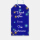 Un tag cadeau de Merci personnalisé avec des lettres de script et de bloc sur l'art vintage élégant d'une lune brillante colorée et étoiles contre une gravure du ciel bleu.