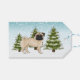 L'illustration originale de Destei d'un mignon chien de race Carlin couleur manteau. Le chien est placé dans une scène hivernale avec trois sapins verts et la chute de neige. L'arrière - plan est un dégradé bleu à blanc qui donne un aspect froid d'hiver. Il y a aussi une zone de texte personnalisable de l'autre côté qui se lit maintenant : "Joyeux Noël !". Un autre modèle de texte a les mots : "TO :" et "FROM :" dessus.