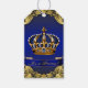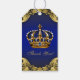 Étiquettes de cadeau pour fête de bébé prince avec une belle couronne bleue et or sur un fond tourbillonnant bleu royal et or. Ajoutez votre texte pour personnaliser votre événement.