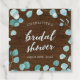 Cette étiquette de faveur rustique comporte des feuilles d'eucalyptus avec les mots "fête de mariage" dans un script tendance, le tout sur un fond en bois marron sur l'avant et un dos de couleur vert sarcelle foncé.