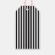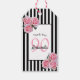 Une étiquette cadeau pour une fête de 90e anniversaire. Classic mince bandes verticales noir et blanc comme arrière - plan. Avec des roses roses roses roses girly et féminine comme décoration. Un cadre blanc et noir sur le devant avec modèle pour l'âge, le nom et la date. Numéro d'âge 90 en rose, nom et date en noir. Le nom est écrit avec un script de style écrit à la main. Avec le texte : Merci. Dos : rayures noir et blanc.