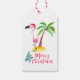Tropical thème cadeau de Noël avec une jolie illustration d'un flamant rose dans un chapeau de santa rouge. À côté d'un palmier vert sur un monticule de sable jaune. Un design tourbillonnant d'arbre de Noël est placé à côté du texte Joyeux Noël. Écrit dans la couleur rose dans une police manuscrite fantaisie.