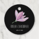 Les étiquettes cadeaux de faveur arrondies personnalisées comportent une belle fleur de magnolia violet et votre texte en lettres blanches chic sur un arrière - plan noir avec votre message personnel sur le dos. Parfait pour les fêtes de mariage, les fêtes de fiançailles, les douches nuptiales et plus encore. Disponible sous différentes formes. OBJETS CORRESPONDANTS dans notre magasin.