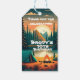 Cette étiquette cadeau d'anniversaire de camping est placée sur un fond d'arbres imposants et de montagnes majestueuses avec un étang serein à la lumière d'un soleil couchant. L'image saisit la tranquillité des grands extérieurs, avec des tons verts et bleus se mélangeant harmonieusement pour créer une atmosphère paisible et accueillante. Une police audacieuse et attrayante annonce la fête, invitant les invités à se joindre à une aventure d'anniversaire sous les étoiles. Avec ses images saisissantes et son design élégant, ce tag cadeau promet une expérience inoubliable entourée de la majesté de la nature.