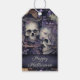 Ces étiquettes cadeaux d'Halloween comportent deux crânes obstinément détaillés, entrelacés de vignes sombres et de feuilles d'automne, accentués par d'élégantes lettres "Happy Halloween". Le style d'illustration vintage mêle romantisme gothique et art ancien. L'option de personnalisation vous permet d'ajouter des noms ou des messages pour une touche de finition distinctive.