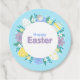 Happy Easter favor tag decorated with flowers and eggs on blue background