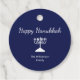 Happy Hanoukka Blue Holiday party faveur tag, avec une simple menorah blanche et la conception typographique script. Avec des lettres personnalisables en blanc, vous pouvez ajouter vos propres informations. Une façon festive de célébrer avec des amis et des proches.