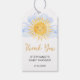 This sun-themed baby shower thank-you gift tag features a cute yellow smiling sun, blue clouds, and stylish script typography.