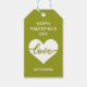 Un tag cadeau de la Saint Valentin design et moderne avec un coeur blanc romantique et romantique décoré du mot "amour" sur un arrière - plan vert olive clair. Facilement personnalisable en ajoutant votre propre texte et nom sur le devant, et votre message de salutation personnel au verso de la balise. Les couleurs de coeur et de texte sont entièrement personnalisables. Convient également à d'autres occasions importantes comme les anniversaires de mariages, les anniversaires, et plus encore.