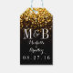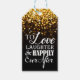 Cette étiquette cadeau de mariage élégante comporte l'expression romantique "To Love, Laughty, and Happily Ever After" dans un graphique style typographique sur un côté de la balise. Customisez le revers avec vos initiales, vos noms et votre date de mariage. L'arrière - plan élégant est noir avec des parties scintillant dorées qui brillent par la pluie.