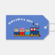 A fun gift tag with a cheery blue background, featuring a colorful blue train with gray puffs of smoke. Inside the three train cars there are pink and white striped gift boxes. The text on the front of the tag reads, "HOLIDAY JOY" which can be customized along with the background color. The back of the tag is white with blue border outline. In the lower right corner a repeat of the three gift boxes. The text on the back can be customized.